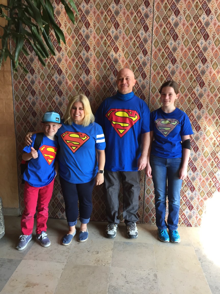 Superman back story. Last year, we came and stayed at this same hotel. A man with a superman shirt was one of the wait staff, and he did a stellar job helping to get our rooms in order. So, to honor him in some way several of us wore Superman shirts today, for when we arrived at the hotel. We also had one for him as a gift.