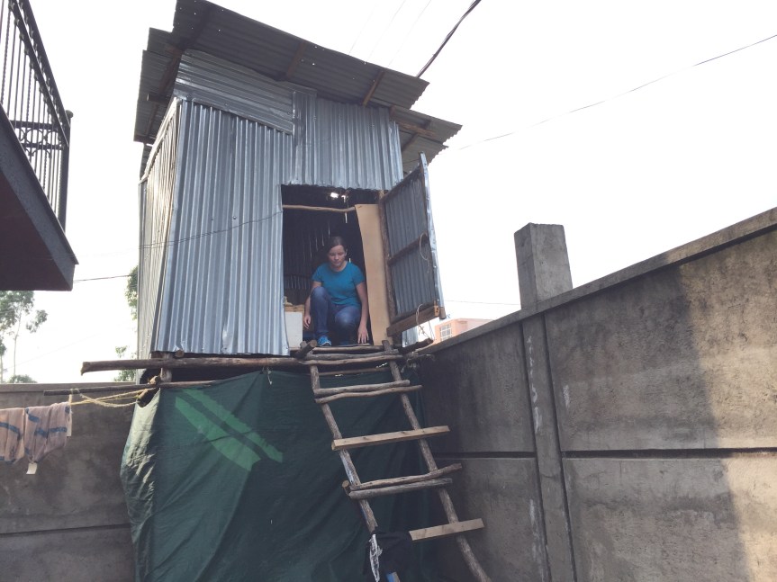 Rachel inside the guard shack. Amazingly, the guard at “The Breakfast Club” lives in this structure. His bed and other personals were in here. I didn’t realize that when I asked to go up and see it.